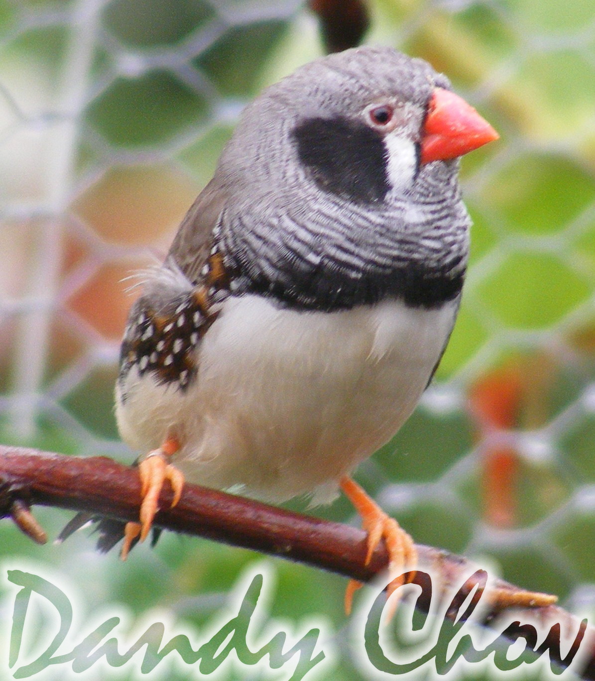Samček: V prírodnom sfarbení je šedý.Má oranžové škvrny na lícach a zobáku ohraničené čiernym prúžkom.Po bokoch má tiež oranžové škvrny s bielym pruhovaním.Od zobáku až po prsia má čierne zebrovanie(podľa toho má aj meno). Brucho má biele,na prsiach čiernu kresbu a chvost je čierny s priečnym pruhovaním.Je omnoho krajšie sfarbený ako samička.